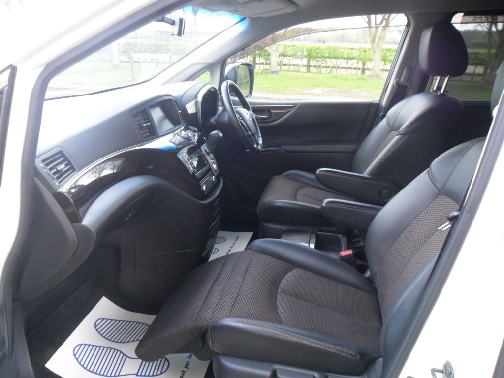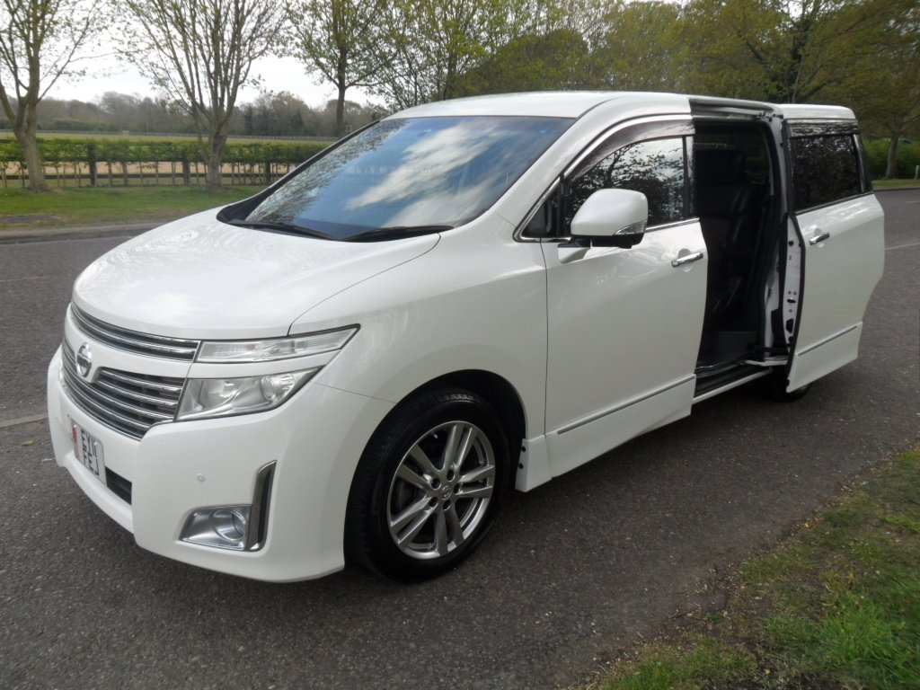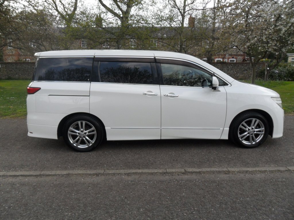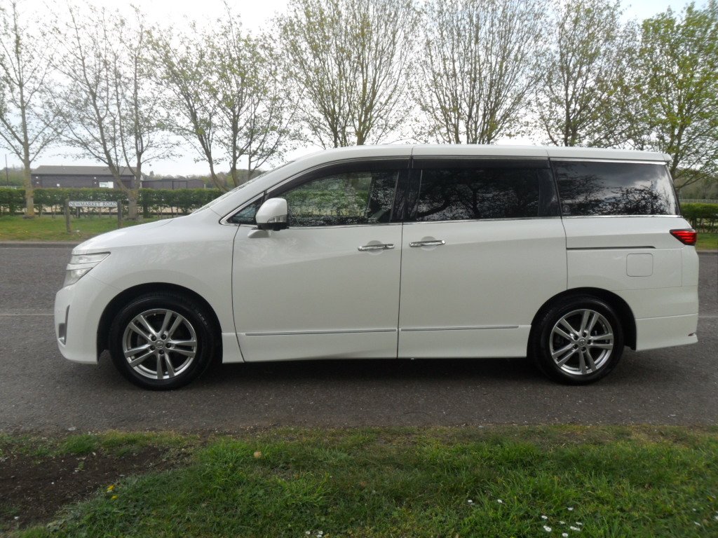 just registered and ready for its new owner this stunning nissan elgrand e52 highway star, remote central locking with keyless entry and start, twin electric sliding doors, duel climate control, alloy wheels, rear parking camera, twin side cameras, half leather interior with reclining seats, power steering, abs, cdradio with bluetooth and phone sync, full japanese service history, eco mode, auto gearbox, cupholders galore, usb connection, alarm/immobiliser, absolutely stunning pearlescent white paintwork.